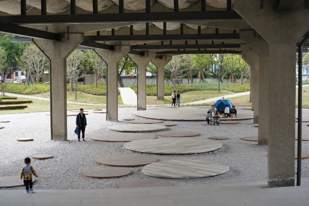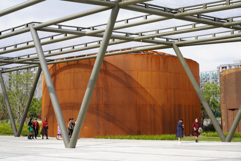 仓储房砖墙般的外墙,用锈色耐候钢组成空心、柔软的钢盒波浪。露天仓库则被做成水面上的圆形浮萍,名为“花阶浮亭”,活泼而灵动。曾经的油库机器老部件也重新融入了公共生活场景。