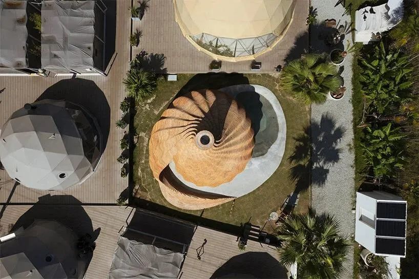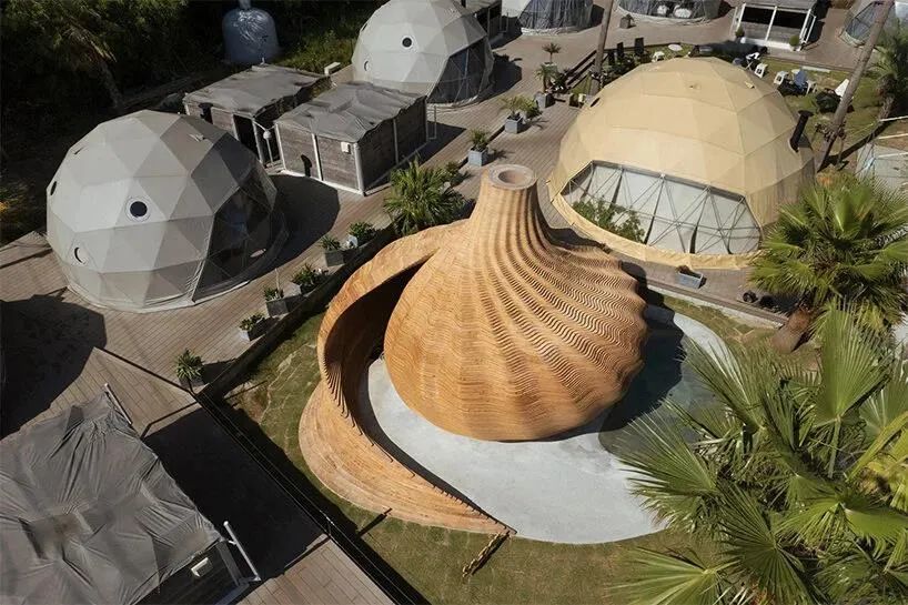 隈研吾事务所为SANA MANE露营基地设计的SAZAE桑拿房位于日本直岛,由桑拿专业品牌TTNE参与监理,呈螺旋形贝壳结构,混凝土底座上铺设了褶皱立面。穿过山洞般的入口进入桑拿房,可以看到顶端的光球,照亮着整个室内空间。