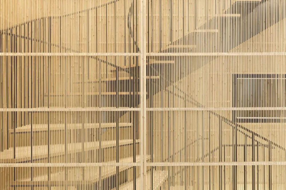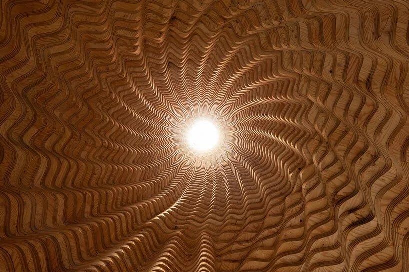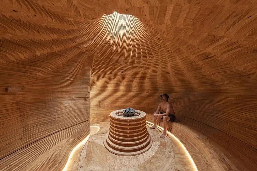 为了获得最终的螺旋形和褶皱形状,隈研吾团队与TTNE的结构工程师一起创建了数字模拟。通常,天花板如此之高的空间不适合桑拿。这是通过执行强制通风来实现的,从顶部进气,从底部排气。通过使用3D CAD和编程软件控制模型,设计师能详细了解从造型到镶板的一切信息,并可以以此反复进行热模拟。