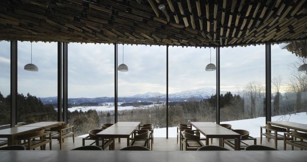 建筑平缓的线性屋顶,与前方日本最著名山脉之一的Awagatake的优雅山脊线遥相呼应。屋檐上运用象征露营生活的木柴覆盖,2万块木柴在建筑内外无缝衔接,赋予了一种建筑中少见的“野性”气质。在建筑中诠释其品牌理念,期望引领访客将活动重心由室内转向室外,拥抱自然。