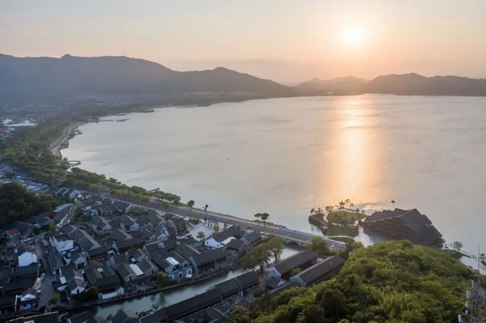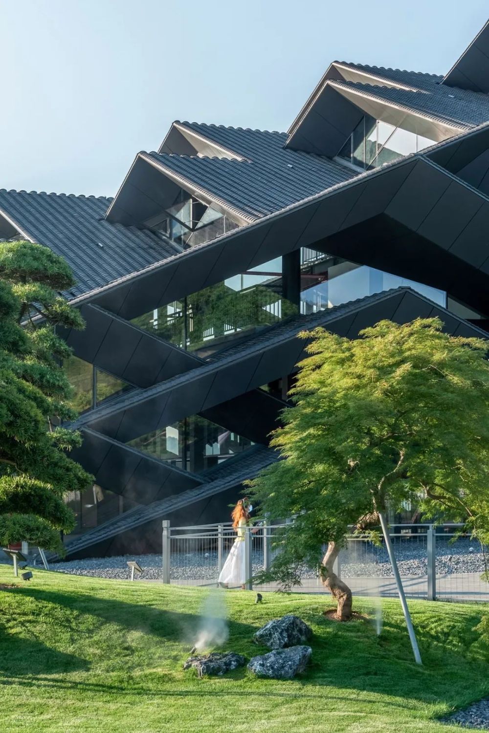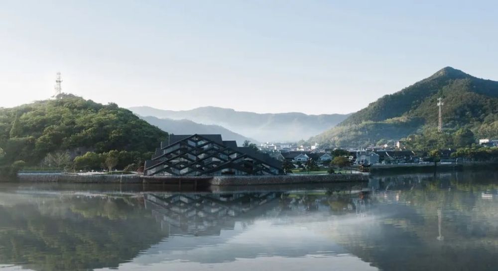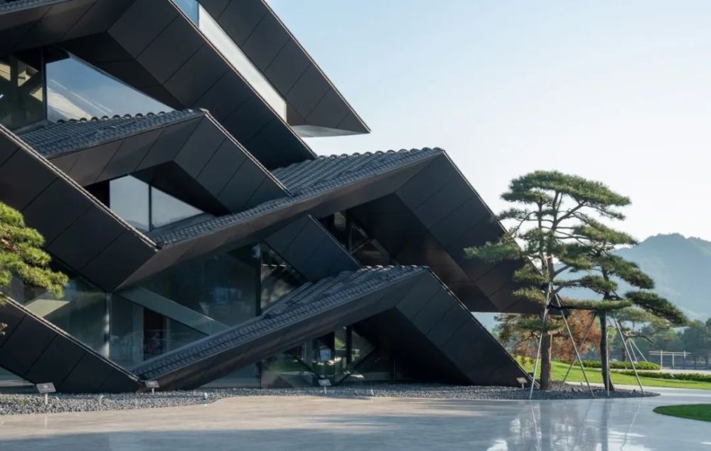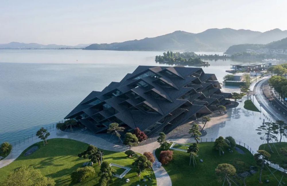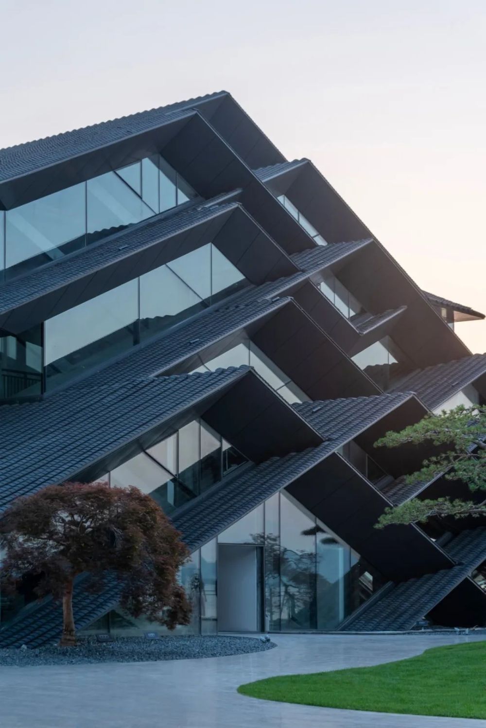 韩岭美术馆位于宁波东钱湖南侧,设计灵感来自于韩岭的瓦,隈研吾将建筑外立面进行退台叠层双坡三角屋面的处理,塑造建筑藏于山景的意境。建筑三层均设立景观台,让人们得以欣赏不同角度的东钱湖风景。