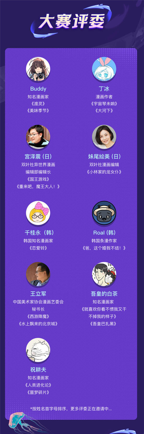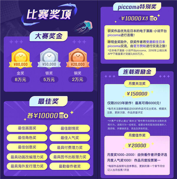 大赛作品征集期为3月31日至7月31日。快看明星作者每月将评选月度佳作,中日韩知名漫画家及编辑评委团将评选出最终的获奖作品。大赛现金奖金池达45万元,包括金奖8万元、银奖5万元、铜奖2万元,及最佳画面奖、最佳剧情奖、最佳角色奖、最佳人气奖、最具改编潜力奖、最具海外发行潜力奖等十项最佳奖,奖金各1万元。同时,今年快看增设piccoma特别奖,该奖项获奖作品除获得奖金并可优先在piccoma平台连载外,作者还将由官方赞助赴日本交流。
