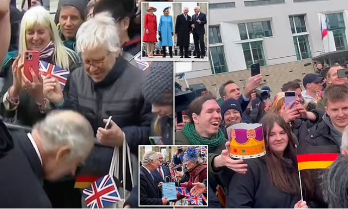 一名男子摘下一顶纸制皇冠,微笑着将它献给查尔斯三世,并说:“如果您想要,这是给您的。”一名女子喊道:“陛下,欢迎来到德国。”