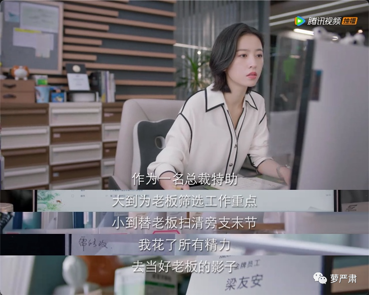 因为不想一辈子做总裁助理所以积极表现独当一面,而又是因为太能干所以变相地被总裁剥削和压榨了。这种剥削并不体现在金钱上,而体现在自我价值和未来的可能性上——她无法证明自己究竟创造了多少价值,也看不到上升空间。越是有能力的人,越能感受到这种焦虑。