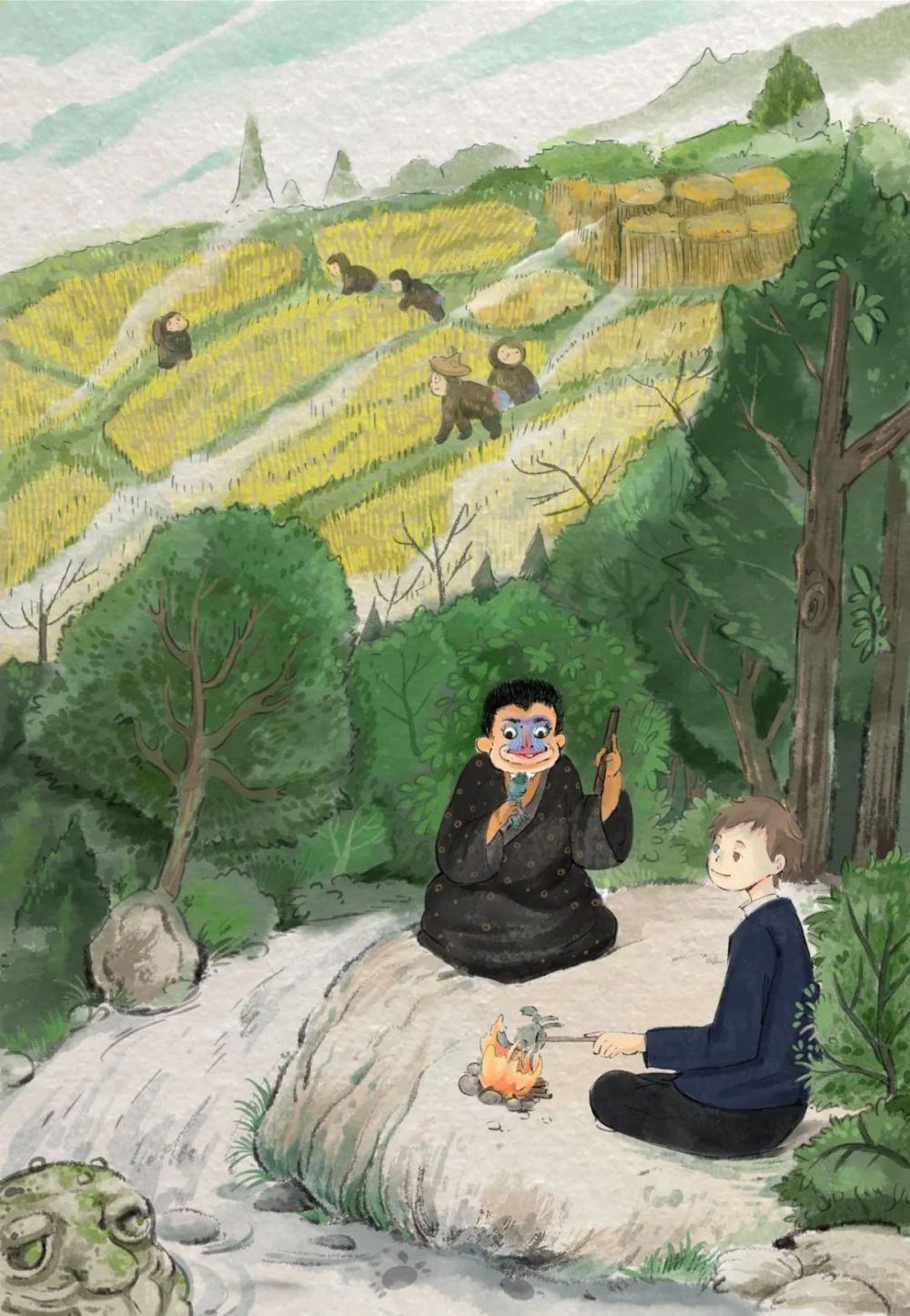 这个妖怪的特性是,它和人相处非常融洽,深山老林中生活的人耕种成本很高,于是他们定下约定,人提供种子,山魈负责耕种,待谷物成熟后五五平分,否则就会遭到惩罚。这其中渗透出的其实是人地合而为一,均衡和谐的相处之道,而这种对人地关系的理解在今天仍然有启发意义。我很喜欢这个妖怪,喜欢这种思考,所以把它重新创作,写入了《妖怪奇谭》中。