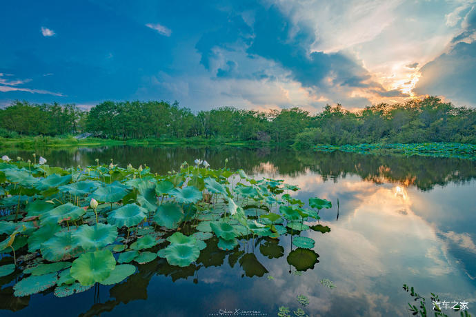 夏日一场阵雨过后的湿地公园,波光云影,待到日落时分,在太阳的余晖下,一片橙红,荷叶和湖水共同组成了一幅绚丽无比的巨幅画卷。
