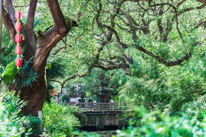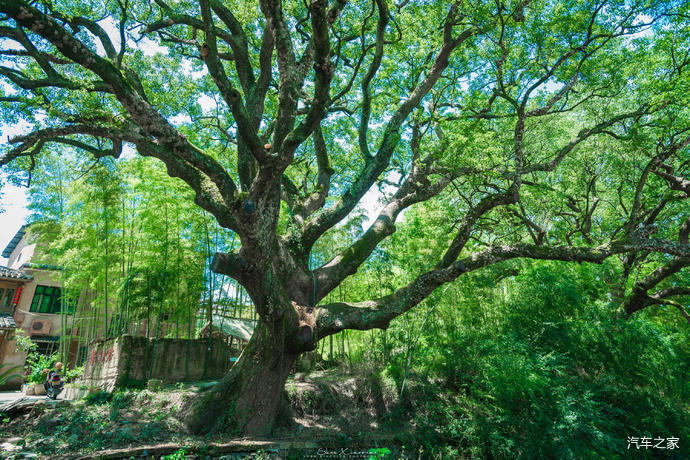 小溪两旁耸立着很多古樟树,既老态龙钟又生机勃勃,樟树枝繁叶茂,绵长的树枝像一道弯琼跨越小溪,郁郁葱葱层层叠叠的树叶提供了很好的避暑胜地。
