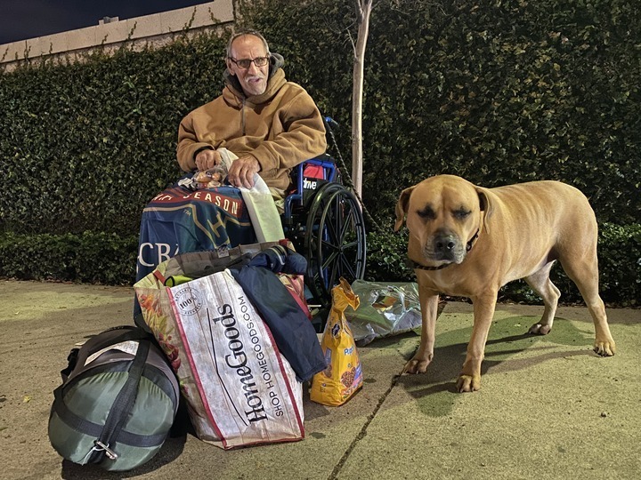 2023年1月13日洛杉矶县海港城区域,无家可归者、72岁的迈克坐在街边一辆轮椅上,旁边是他收养的黄狗。新华社发(曾慧摄)