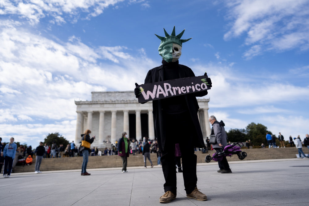 2月19日,在美国首都华盛顿,一名抗议者手举标语在林肯纪念堂前参加反战集会。新华社记者刘杰摄