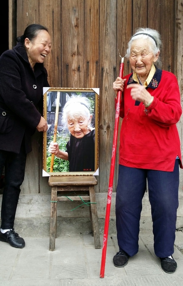 事情的起因是,那年3月,我在成都大邑县新场古镇,碰到94岁的刘杨氏婆婆。她刚干完活,停下来休息,我就随手拍了一张。过了几天,我把放大的照片装了相框给她送去,想给老人一个惊喜。
