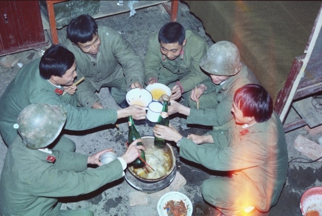 其中一位战士叫陈思祥,是连队的勤务员,和战友开了大卡车出来买菜。他就带我们去见连长。连长姓孟,很年轻,是四川眉山人。战士们在前线打仗,思念家乡,见到我们很高兴,晚上叫来一拨老乡,坐在猫耳洞里,煮火锅,吃罐头,喝啤酒。