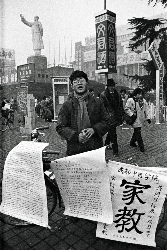 照片里是1994年寒假,成都天府广场高大的毛主席塑像前,刘清付戴着老式的大框眼镜,系着围巾,站在自行车旁,正招揽家教生意。那一幕,被当时在街头拍照的我记录下来。