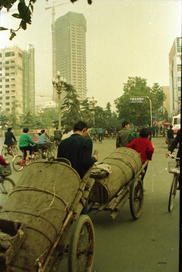 有一次,我路过人民南路,看到进城来拉粪的两辆板板车,觉得稀奇,顺便用剩下的几张胶卷抓拍下来。我敢说这样的照片,除了我,成都再没有人拍过。