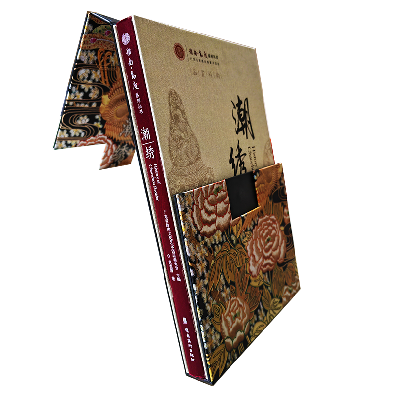 岭南·高度系列丛书是由广东十三家国企组成的广东省岭南文化艺术促进基金会全款支持的项目,《潮绣》一书是岭南·高度系列丛书之《品赏岭南》系列的第一本成书,是广东企业参与地方文化保护的首例,具有一定的社会意义。成书为异形16开(320mm*210 mm),19印张,四色精装彩印。