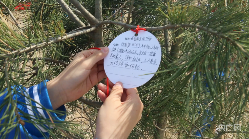 “希望我们种的小树健康长大”“愿小树和我们一同茁壮成长”“希望能为地球添一片绿”……植树结束后,同学们纷纷将自己的树牌和心愿卡挂在树上,写上对大自然的祝福。