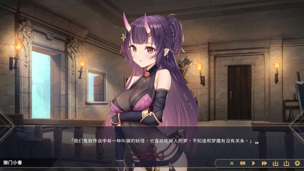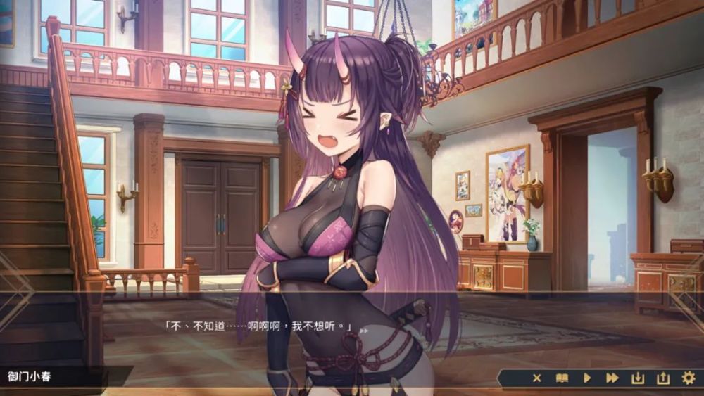 本作的插画质量完全达到了优秀商业“黄油”的水平,用两个字评价就是 “很顶”!以童颜巨〇的御门小春为例,为了凸显其“东方忍者”的角色魅力,除了鬼角和佩刀等标志性元素外,立绘上还细心地加上了注连绳、樱花发簪、眼影等装饰,其余部分则用深紫色的半透明薄纱覆盖,再用手里剑纹样和边角处的暗金做点缀。这样的设计既衬托了小春白皙的肌肤,大面积的镂空又能使她在战斗时能自由活动。