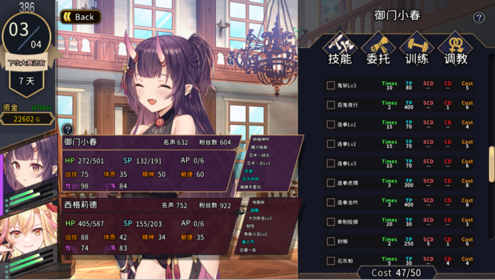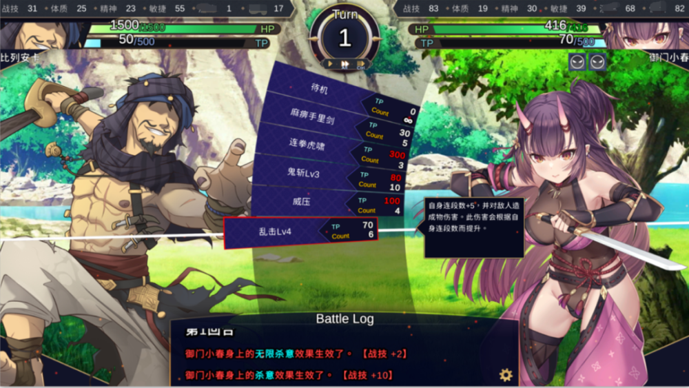 到了角斗的那一天,主角就可以指挥上场的角色与对手进行回合制战斗,如果你在之前对你的奴隶们进行了足够多的训练,那她们就会获得更多的技能,在战斗时就可以挑选合适的技能去针对对方。