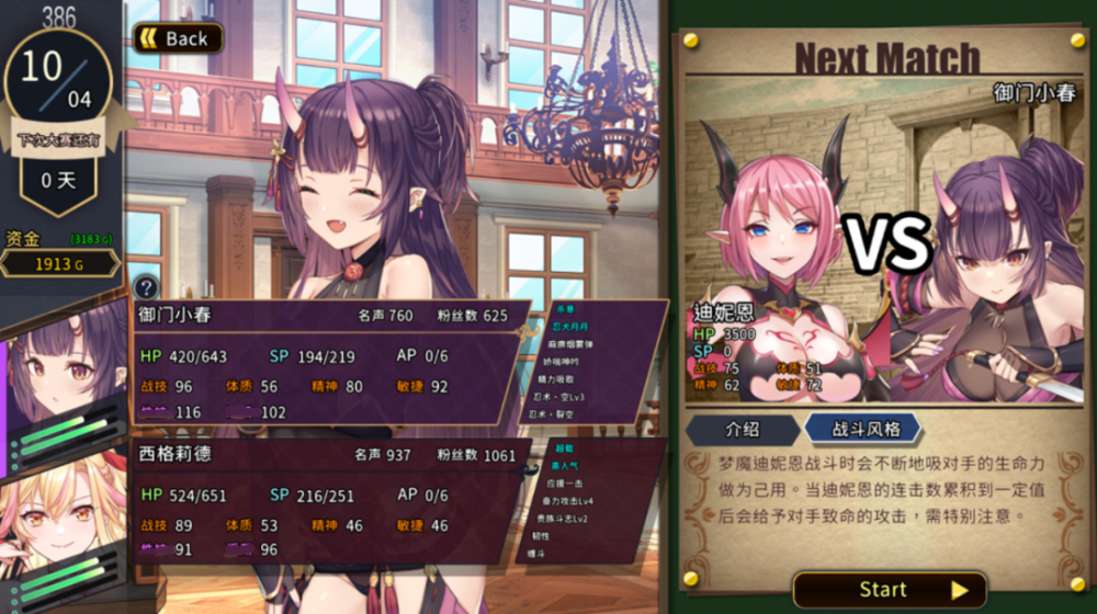 本作故事流程的主要推进方式可以看做是简化后的模拟经营类游戏。每十天,玩家将要进行一次角斗竞技,而在此之前,玩家可以通过消耗每日行动点数,派遣2位女主去打工赚钱或者训练调教她们以提升各项属性。每经过2天,游戏就会自动触发一段主线事件,它们可以提供额外收入,但也有可能直接触发Bad Ending,所以点击选项之前一定要记得存档!