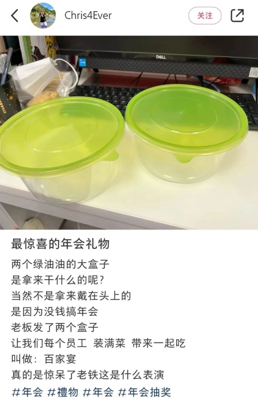 为了营造虚假繁荣,有“责任心”的老板亲自上阵准备年会,一人发俩菜青虫配色的大盒子,让员工们在家装满菜带来公司一起吃,还称之为“百家宴”。
