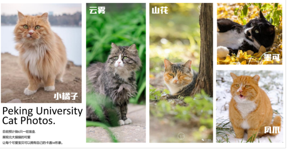 系列一是独属燕园的“北大猫猫盲盒”。猫协是北大的“人口大社”,想必大家仅凭这一点就能看出我校“猫奴”众多。作为“猫猫教”的“信徒”之一,我们选择了五只明星猫咪作为盲盒建模原型,并加上一只尚未对外公布的“隐藏款”猫咪作为此次我们用3d建模技术重现的对象。由于它们太过于可爱,所以我们在选取“主子们”的建模姿态时着实伤了一番脑筋。多亏有《从数字雕塑到3D打印》李添老师和戴放老师专业、耐心指导,我们才能够使作品以草图上看似难以建模的动作呈现出来,谁看了不赞叹一句老师们的给力啊!可惜因为时间和精力有限,目前只有小橘子和姜丝鸭的模型能够在讲堂咖啡厅与大家见面,希望毕业之前我们两位“鸽王”能够完成本系列的全部作品!