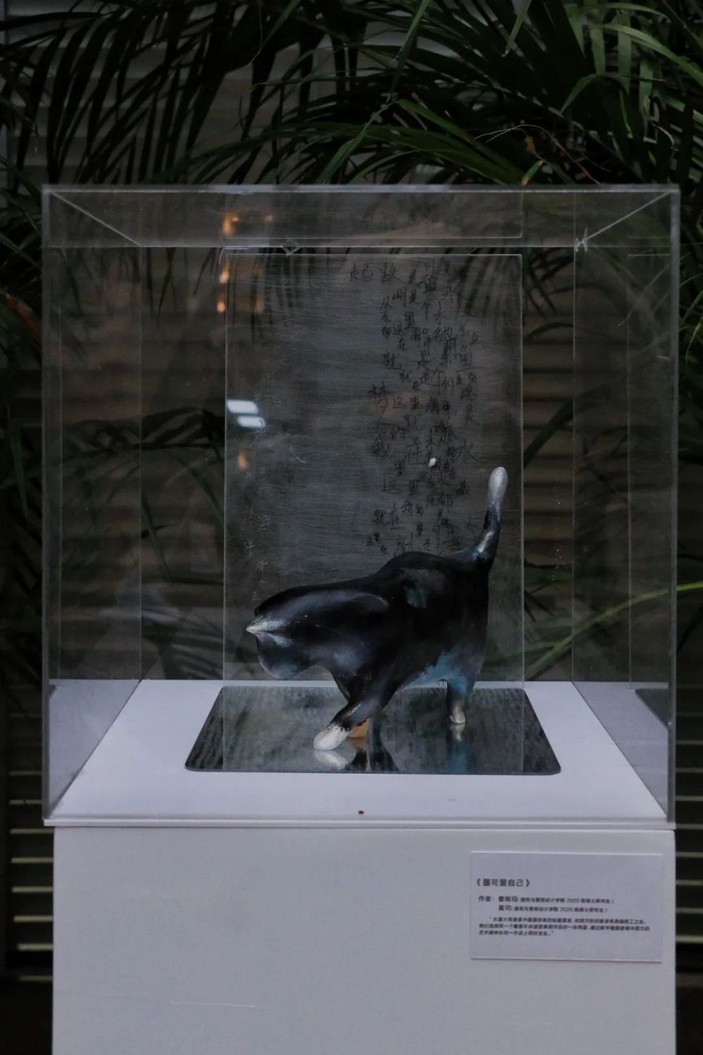 最开始想做猫咪是因为曾经学院养过一只小猫,一只鼻子上有白色斑点的狸花猫。我们所有人都很喜欢它,上课讨论的时候它会跳到桌子上,在电脑和数据线之间走猫步。猫咪神态的原型就是挺着小胖肚子拧来拧去的图图,后来进一步细化的时候想起来图图严格说不算是燕园猫了,因为它被一位学长领养,所以我们才改成了未名湖边我们的第二爱猫——墨可。小猫咪身上总有一种捉磨不定的沙雕又神秘的气质,就像图图,我们经常看到它坐在窗子前看着湖面发呆,是不是在思考什么猫生哲理?就像墨可,它成天出没在湖边,没人的时候,会不会跑到水边上去照照自己的影子,盯盯水里的鱼?以上均是我们对小猫咪的无礼猜测。在老师的艺术指导下,我们决定用镜面、亚克力板、丙烯颜料和快废掉的手来塑造这系列二中的墨可。