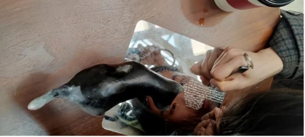 这一门课程十分精彩,不仅精彩于课堂之上,还精彩于课程结束之后我们准备作品展出的过程,这个过程为我们带来了不逊于艺术课堂本身的艺术体验。比如布展前我们希望对镜面进行处理使其呈现出未名湖的意境,尝试了涂抹、拼贴等多种方法,效果都不太好,最后老师鼓励我们用刻字的方法使边缘表现出磨砂的质感,来勾勒未名湖的轮廓。由于初期的表现效果不太好,小戴老师反复建议我们再刻密集一些,我们对此表示担忧:“如果带着朋友来看展,人家觉得我们神经质怎么办?”老师答道:“还不够神经质!就是要神经质!”因此我们也戏称她为“乌老师”(哈利波特中惩罚哈利在手上刻字的乌姆里奇)。