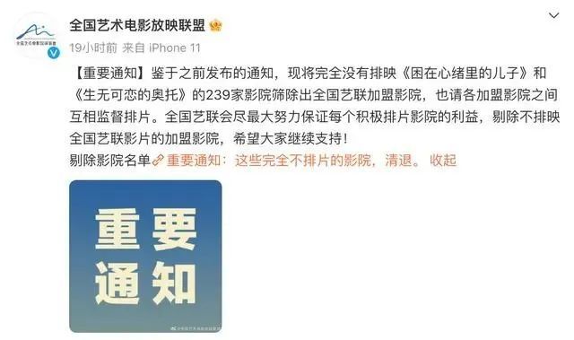 3月31日,全国艺术电影放映联盟(简称全国艺联)发布重要通知,将完全没有排映《困在心绪里的儿子》和《生无可恋的奥托》的239家影院筛除出全国艺联加盟影院,也请各加盟影院之间互相监督排片。