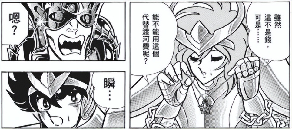 要不说这卡隆还是有点东西的,看了瞬半天,可能是看出了瞬是冥王哈迪斯的人柱力,表示瞬的眼神清澈,应该是有资格去极乐净土的人,所以他不仅归还了项链,而且决定继续带两人过河。等到了对岸,卡隆突然又脑抽的表示还是得给钱,要不然会再次将星矢揍飞到河里,估计是车田也看不过去了,直接安排星矢将卡隆揍晕了过去。