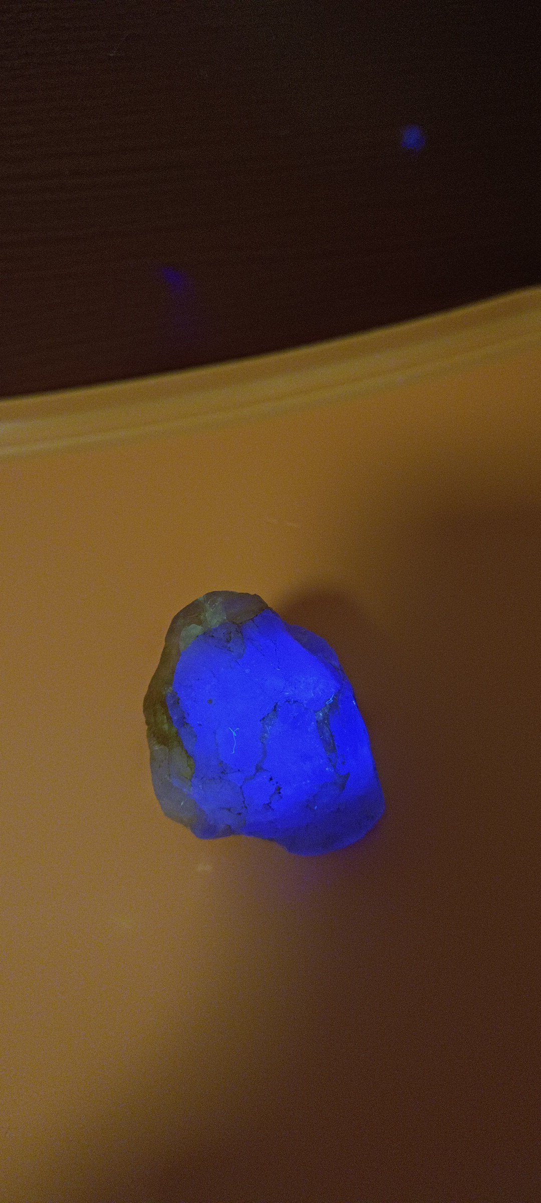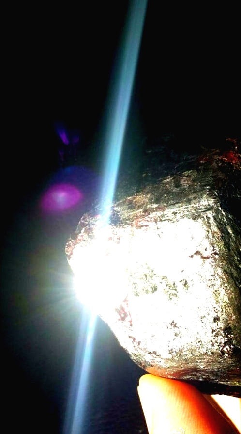 外面有一层很坚硬的白石皮,我只是手电照了几次,发现象一颗宝石,因为我用手锤砸了几下砸不开。