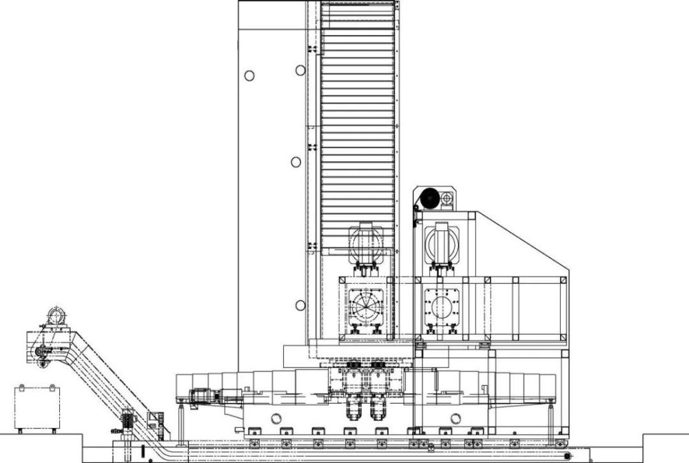 由于数控刨台卧式铣镗床的主轴加工功能有限,因而需要多种附件头共同配合加工,完成多角度孔系、面的加工工序。传统的附件头安装费时、费力,严重影响生产效率,尤其是频繁使用附件进行切削加工时,附件头的拆装便成了其中一项举足轻重的工序。为解决附件头安装不便、可靠性较差的问题,自动换头系统应运而生。自动换头系统是在自动化加工过程中存放和更换附件头的一种装置,可大幅提高换头效率。自动换头头库在龙门式铣镗床中应用较为广泛,特别是在加工风电船舶叶片、大型柴油机机体等零件时发挥着重要作用。目前,国内大型刨台数控卧式铣镗床的厂商生产的产品仍是手动更换附件头,国外的一些厂商采用的都是自动更换附件头,不仅价格昂贵,而且占用的空间较大。相比数控落地式铣镗床、龙门式铣镗床,刨台式铣镗床空间布局有限,且无法通过移动机床主轴实现附件头的抓取,同时考虑到机床成本,用户场地限制等因素,设计了一种新型的立体换头头库[1]。