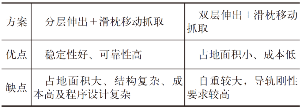 根据用户加工工件的总体需求、附件的数量以及工况的要求,设计了2种立体头库形式:分层伸出+滑枕移动抓取、双层伸出+滑枕移动抓取。2种方案特点见表1。