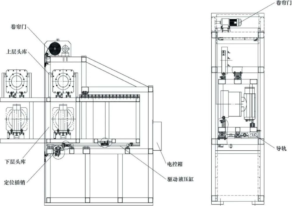 经充分考虑用户场地布局、操作人员使用情况及总成本预算等因素,选择了双层伸出+滑枕移动抓取形式。此立体头库共设计2个换头工位,为保证头库推出时的整体刚性,减少伸出挠曲,下层工位存放直角铣头、万能铣头、延伸铣头和平旋盘等自重较大的附件,上层工位存放主轴保护罩。为方便操作人员对刀观察等操作,将头库安放在操作区附近,由于距离切削区较近,因而需要较好的防护。设计电动卷帘门对头库各部件进行有效保护,防止切削液及切屑对头库部件产生损害及干扰。