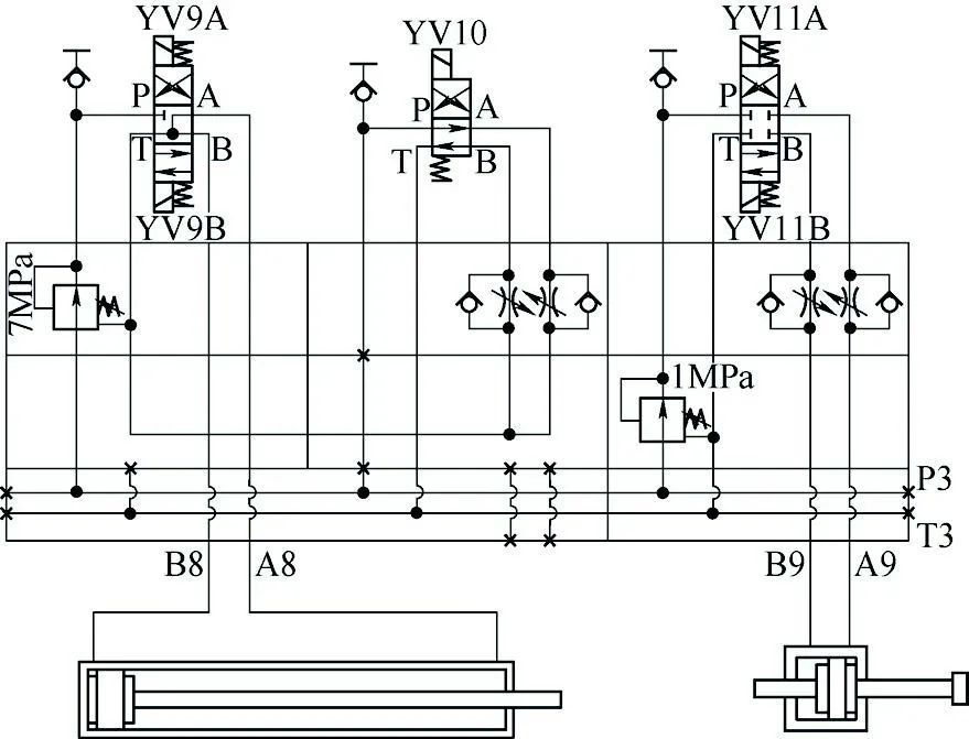液压系统的液压损失包括各段管路的液压损失、局部液压损失和各元件液压损失之和。由于液压缸的工作液压低于系统液压,故在油路中设置减压阀,为保证到达换头指定位置时,液压缸移动过程中的平稳性,在油路中设置调速阀[2,3]。液压原理如图3所示。