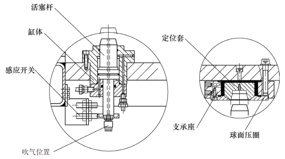 为确保每一次滑枕抓取附件头的位置准确且提升头库的柔性化、自动化程度,提高自动更换的可靠性,需要精准的定位装置和柔性装置。当移动支架到达指定位置时,液压油推动活塞杆在缸体内移动,运动行程为25mm,将其推进至定位套内,活塞杆采用鼻端倒角,定位套采用球面可调形式,支承座上设计灌胶孔及排气孔,定位套调整至活塞杆与定位套接触良好时,用高精度定位胶进行定位,活塞杆与定位套需要配磨,保证其接触率≥90%,且由于活塞杆的频繁使用,表面还需要渗碳淬火处理,定位装置如图4所示。当活塞杆到达预定位置时,感应式开关会发出到位信号,机床开启吹气指令,此时滑枕便可进行抓取。将附件头归还至头库时,液压油推动活塞杆脱离定位套,当活塞杆到达初始位置时,感应式开关发出信号,移动支架便可缩回。