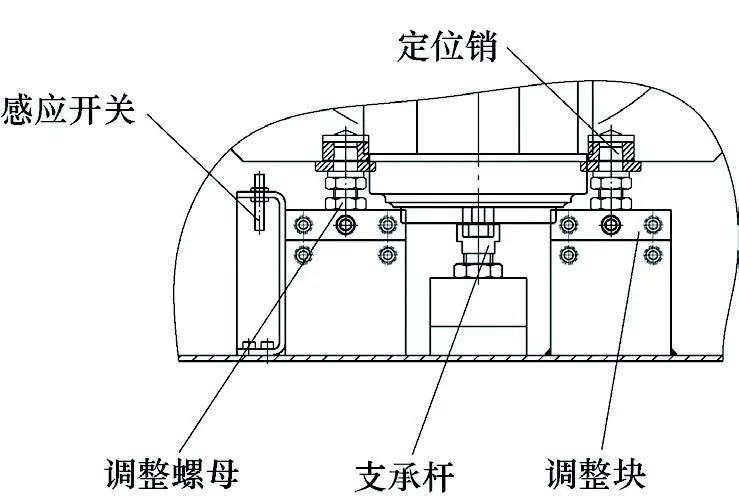 为保证每次附件头更换时附件在移动支架上的位置准确,还需要对附件头在支架上的位置进行定位。当附件头归还到头库时,通过支承杆与双定位销进行“三点”定位,同时感应开关发出到位信号,附件头到达指定位置。附件头在支架上装配时需通过双螺母及调整块进行调整,调整后将其锁紧,支架上定位装置如图5所示。