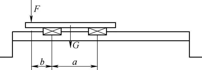 立体头库是一个常用的机床部件,需要频繁伸缩,而导轨的刚性、精度、承载能力及使用寿命对于头库的工作质量至关重要。考虑到使用的工况、载荷、安装空间、移动支架伸出时整体的刚性,选择GGB35 AB2P2×2000-4双滚柱直线导轨。这种导轨的额定动载荷、静载荷分别为Ca=35.1kN、C0=47.2kN,硬度系数fh=1,温度系数ft=1,接触系数fc=0.81,精度系数fa=1,载荷系数fw=1.2,移动支架自重G=200kg,附件自重F=400kg,P为当量动载荷Fmax ,额定寿命单位K=100km,指数ε=10/3,行程La=1000mm,每小时往返次数n2=2,力学简化模型如图6所示[5]。