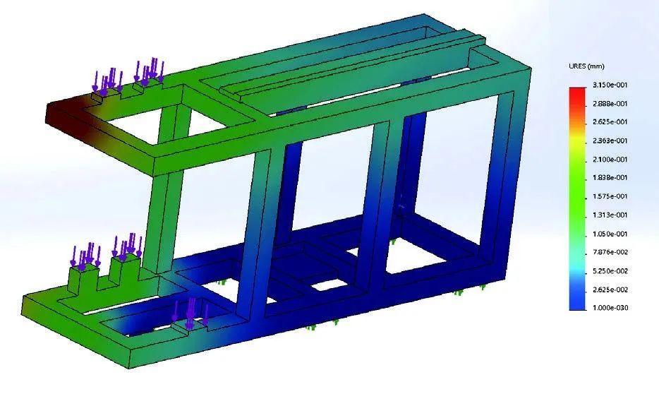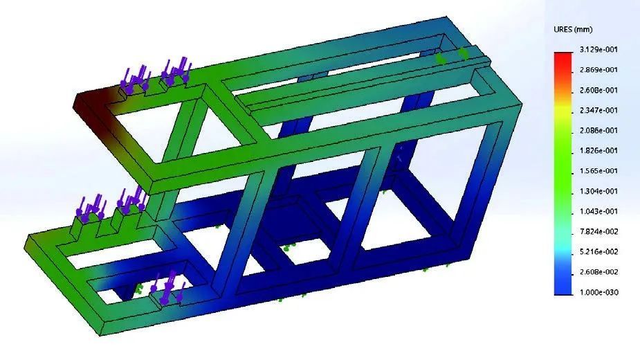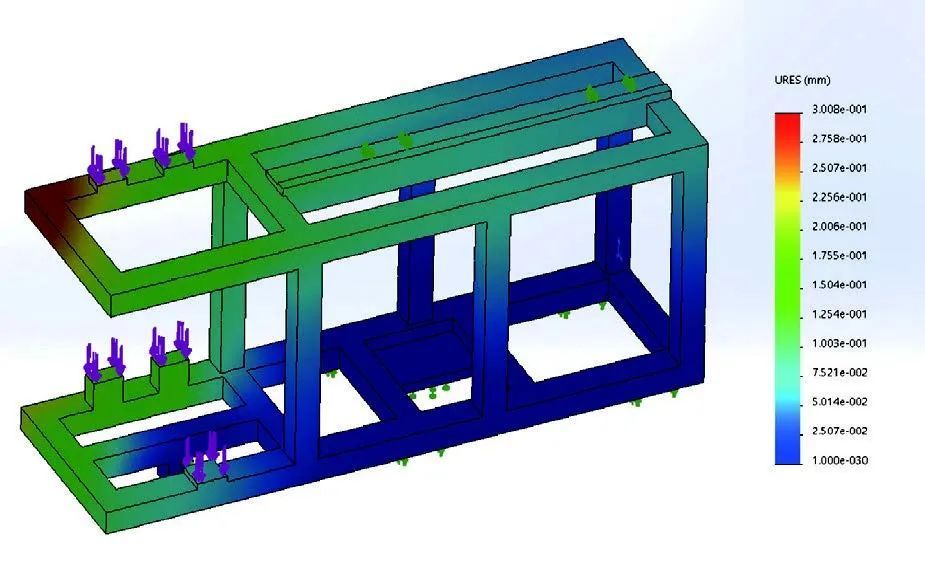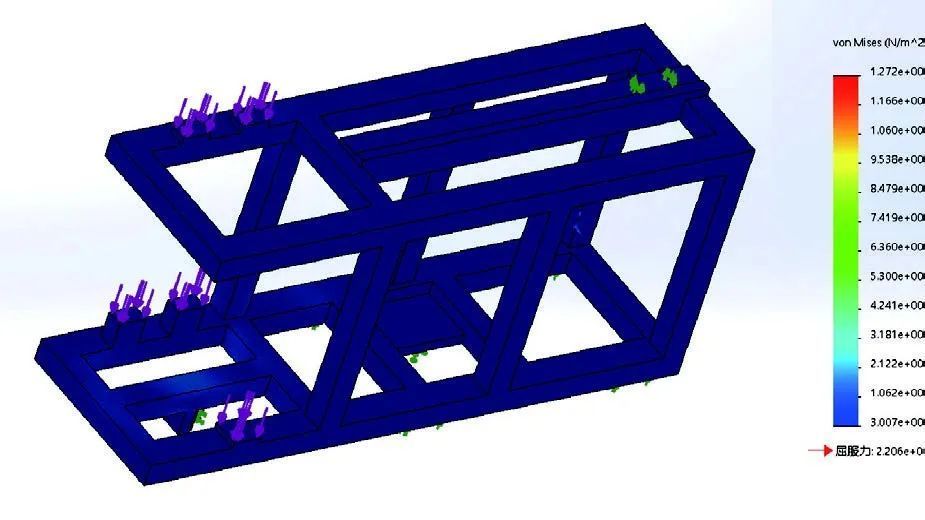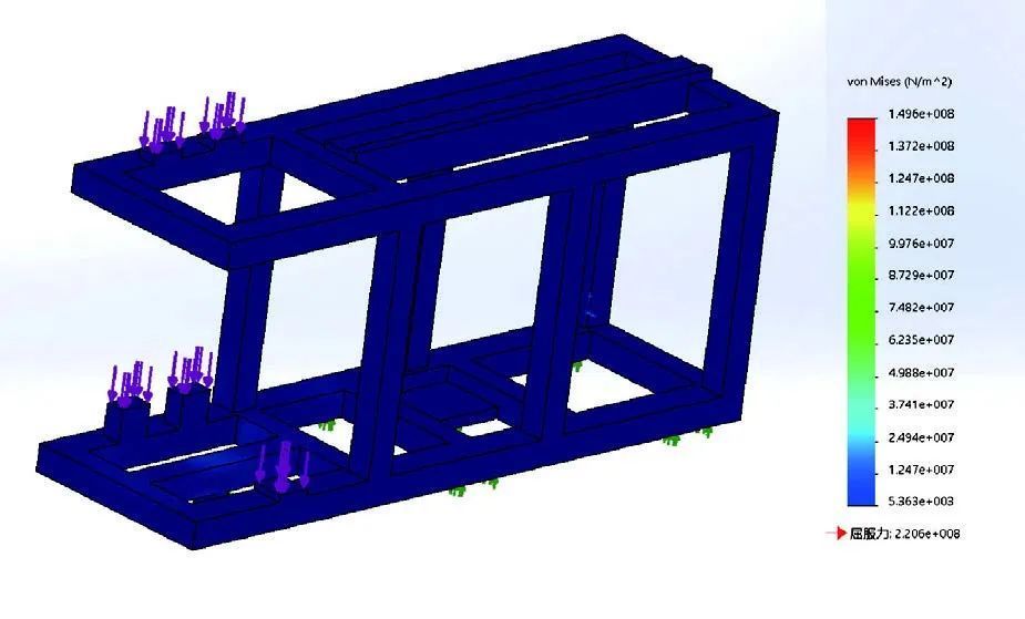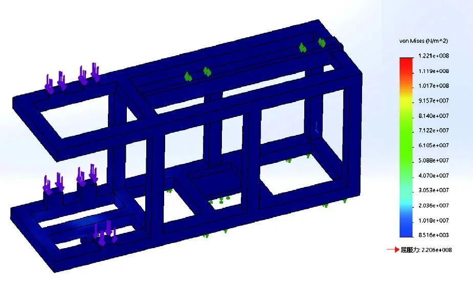 为保证移动支架的整体强度同时减少变形,设计“三导轨”布置形式,在移动支架上方布置一条辅助导轨。现对支架移动到行程极限时,支架的受力情况进行分析。利用Solidworks Simulation进行强度分析,结果如图7、图8所示。