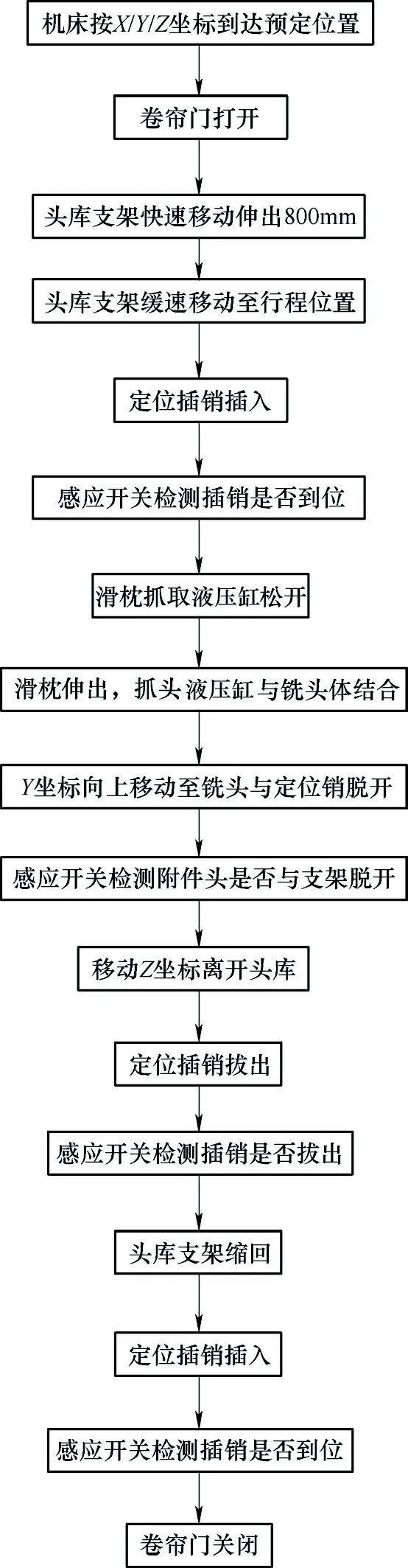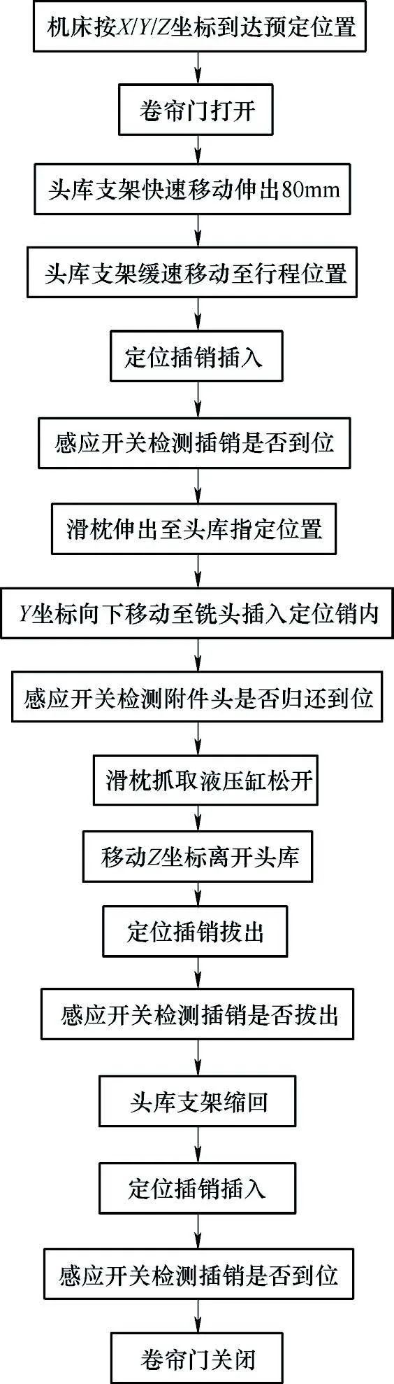 为进一步实现立体头库的自动化、智能化水平,在机械结构、可靠性设计完成之后,还需要电气对其运动逻辑顺序进行下一步设计。铣头按控制流程可分为铣头出库和铣头归库两个步骤。自动抓取和归还附件头的位置必须准确,因而铣头在每一个运动过程中都需要有安全保护,动作到位指令,防止误操作发生碰撞,影响铣头的位置[7,8]。抓取附件头和归还附件头逻辑顺序分别如图9、图10所示。