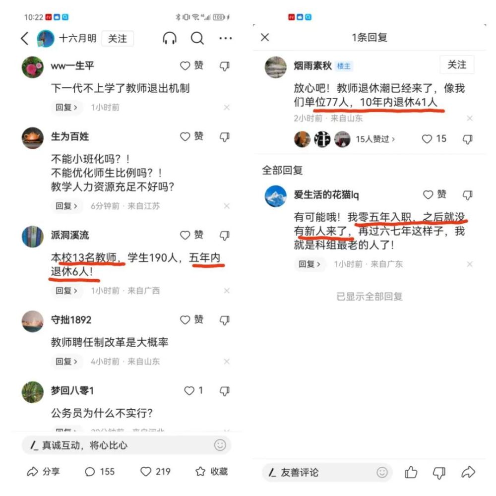 这一个时间段出生的教师,也都进入退休阶段了。据网友留言,一所学校13名教师,5年内退休6人、占比46.2%;另一所学校77名教师,未来10年内退休41人、占比高达53.2%。