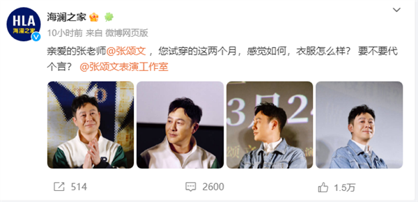 3月28日早间,海澜之家的官方微博发了这样一条动态,“亲爱的张老师,您试穿的这两个月,感觉如何,衣服怎么样?要不要代言?”并@了张颂文及张颂文表演工作室。