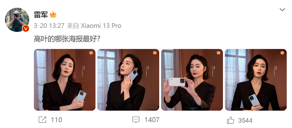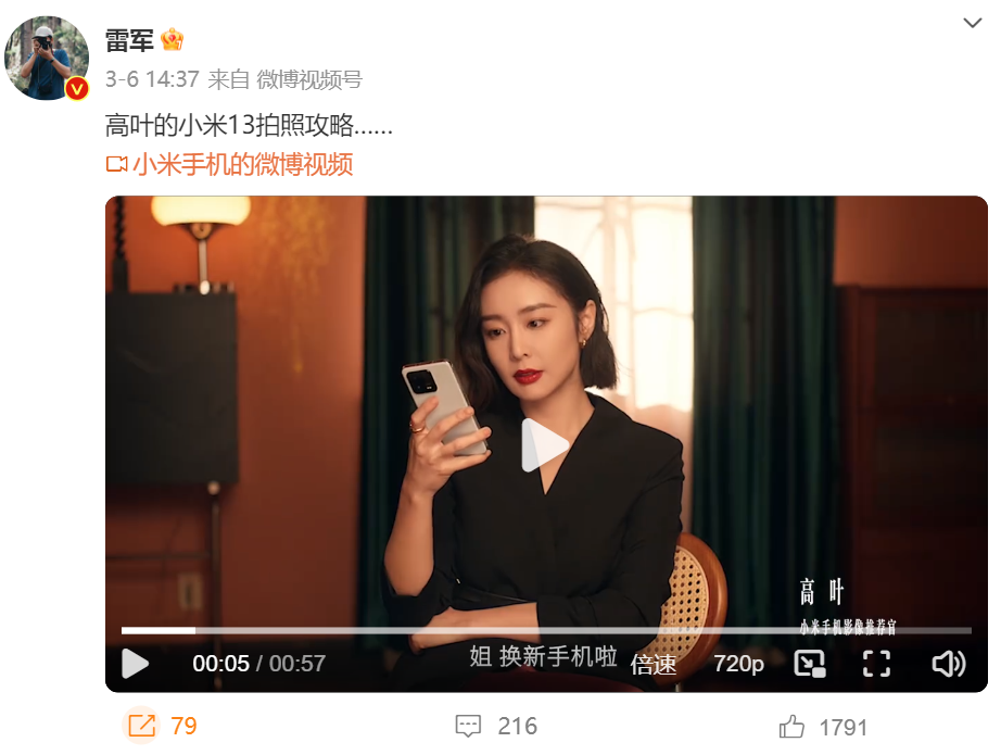 《狂飙》大火后,中免日上成为高叶第一个官宣商务合作的品牌。小米也是紧跟热度,于3月3日重磅官宣高叶为手机影像推荐官。雷军更是在微博晒出了多张小米13拍摄的高叶人像照及视频。