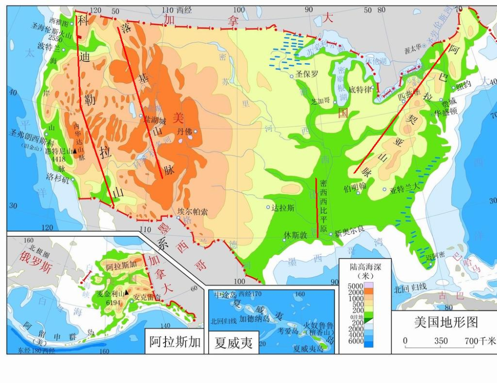 美国的主要河流和湖泊有密西西比河-密苏里河、哥伦比亚河和五大湖。我们来看看大致情况。