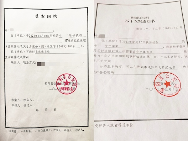紫阳县警方受案回执及不予立案通知书 受访者供图