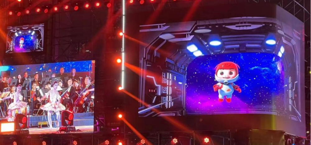 包括小天使“小彩”、“宙响天河”字幕和“猪猪侠”等L屏裸眼3D和主屏十个节目的单屏裸眼3D, 形象生动、增强舞台虚拟进深感和丰富的空间感。
