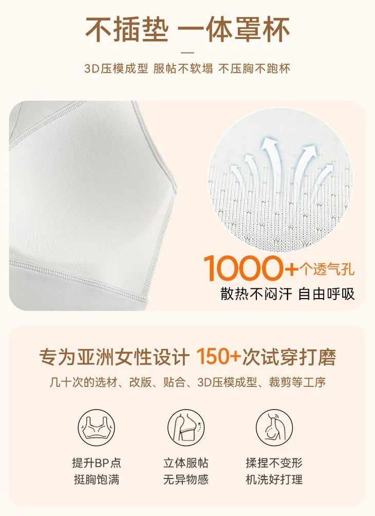 后背面料是透气的薄纱,网纱快干吸汗,透气排汗好,不容易闷着,本来内衣就紧身,一旦闷汗多了就容易导致皮肤发痒不适。