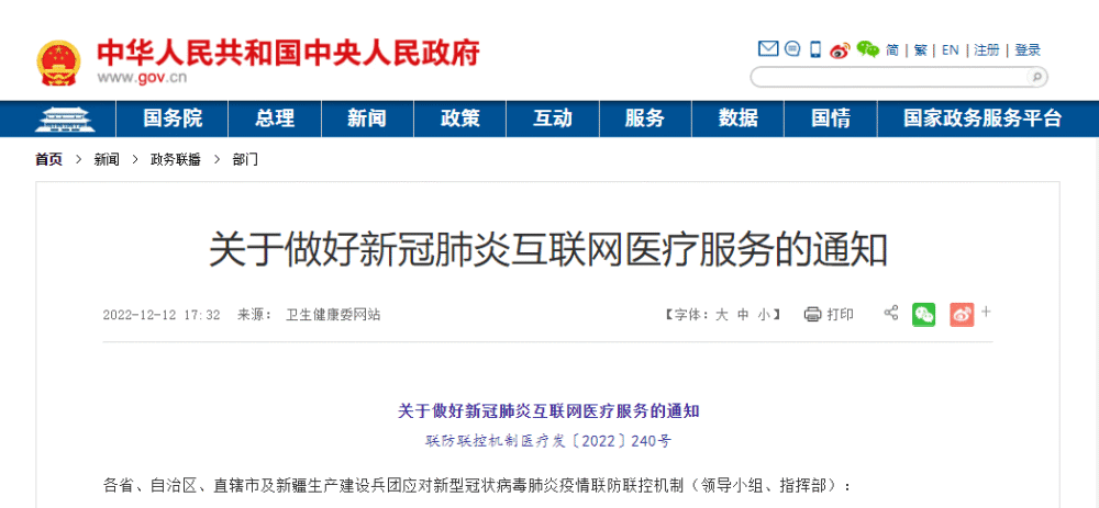 为了进一步缓解线下诊疗的压力,方便人民群众获得健康咨询、就医指导、预约诊疗等服务,降低交叉感染风险,12月12日,国家卫健委发布《关于做好新冠肺炎互联网医疗服务的通知》(以下简称《通知》),鼓励医疗机构为新冠病毒感染者提供在线诊疗服务、在线开方、药品配送等服务。