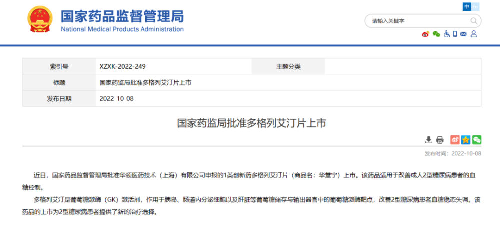 10月8日,中国国家药监局(NMPA)宣布,批准华领医药的1类新药多格列艾汀片上市,用于改善成人2型糖尿病患者的血糖控制。该药是全球首款葡萄糖激酶相关的药物,有望从源头上缓解糖尿病。
