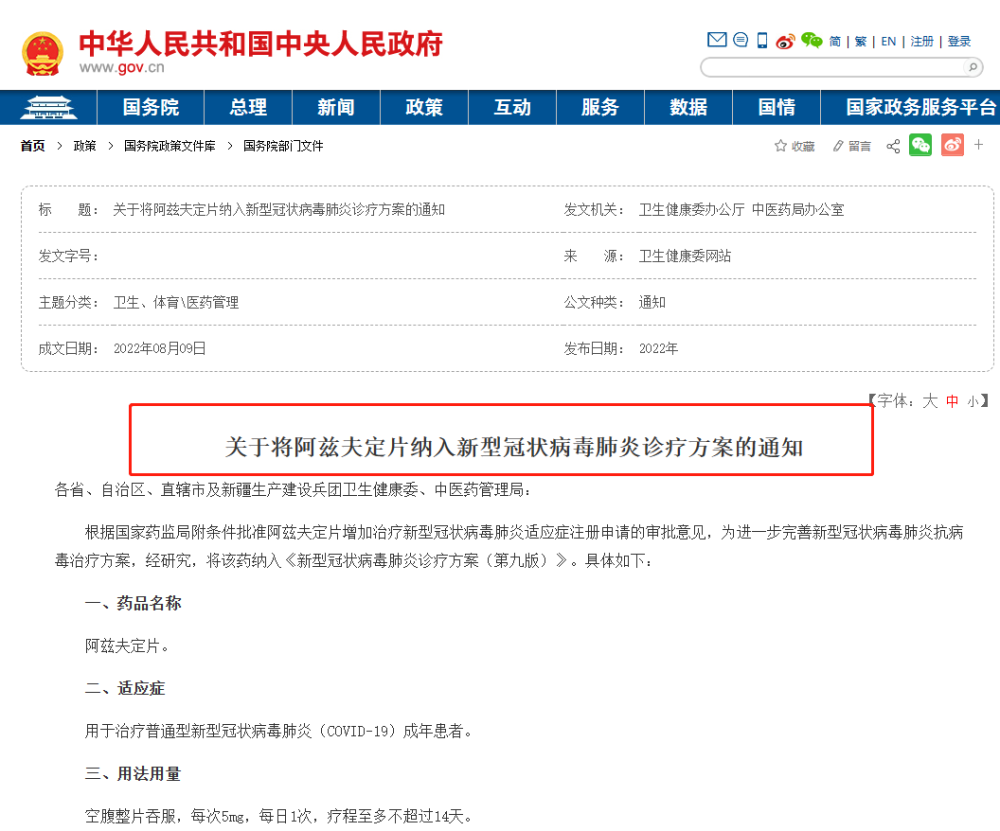 2022年7月25日,药监局附条件批准真实生物的阿兹夫定,增加治疗新冠病毒肺炎适应症的注册申请。并于8月9日,阿兹夫定片被纳入《新型冠状病毒肺炎诊疗方案(第九版)》(下称《诊疗方案》)。