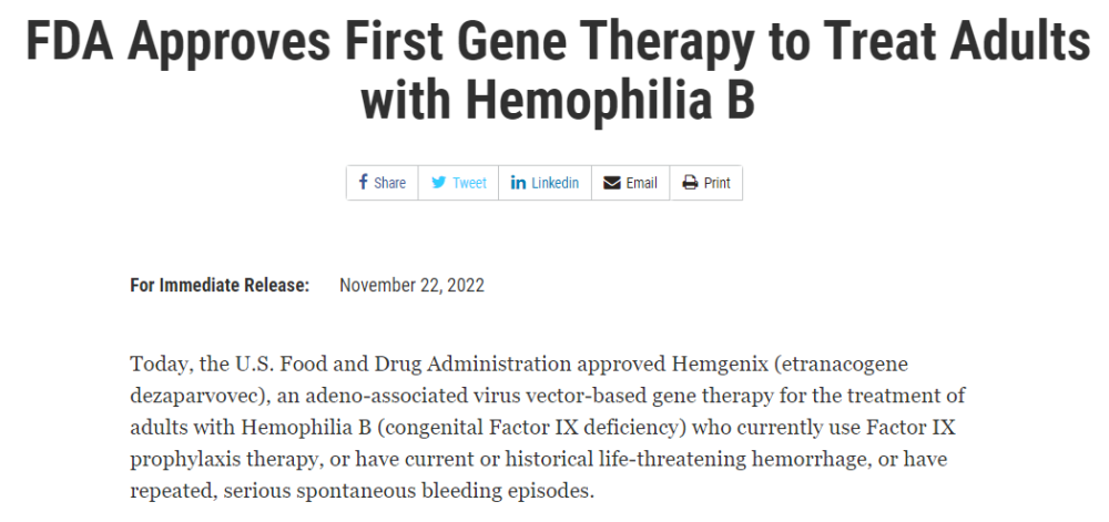Hemgenix是全球首个B型血友病基因治疗药物,通过静脉注射单剂量给药,用于治疗患有B型血友病的成年人。