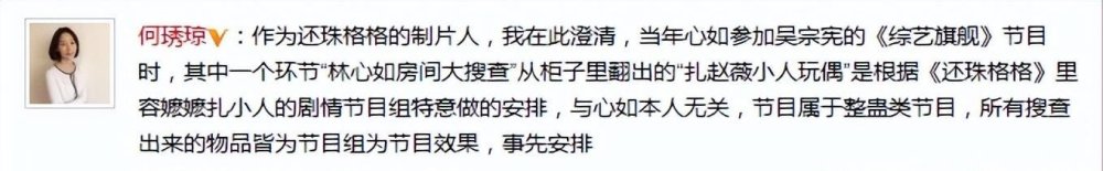 《还珠格格》的制片人站出来帮林心如澄清所谓的“扎小人”谣言,表示只是节目的恶搞,和林心如本人无关。